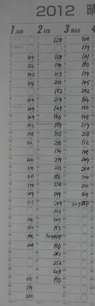 ついでに、今年の練習カレンダー(5bカスケードのキャッチ数)