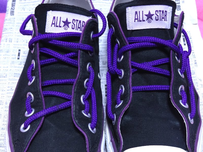 履き古した靴でフットストールしやすい結び方がないか色々と試してみました。